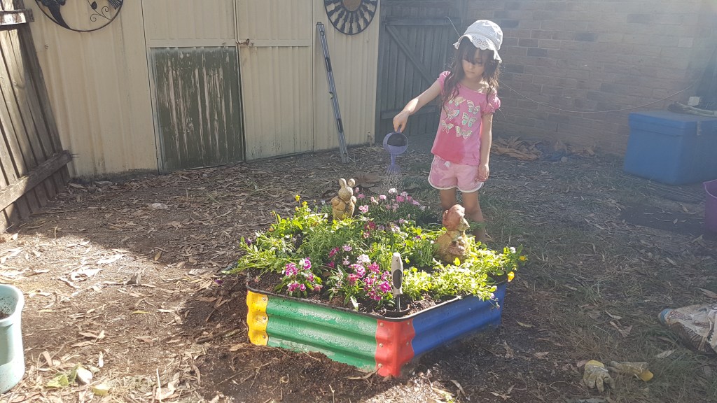 Transplanting was initially delayed by my indecision about the best location for the flowers, then inspiration struck! What about the sandpit that the children never use?! It’s perfect for a raised garden bed. Without further delay, it became a whole family affair. My partner moved it to a sunny location and filled it with some potting soil kindly given to us when a local nursery closed down last year. I mixed in some Dynamic Lifter and the children helped plant the seedlings.