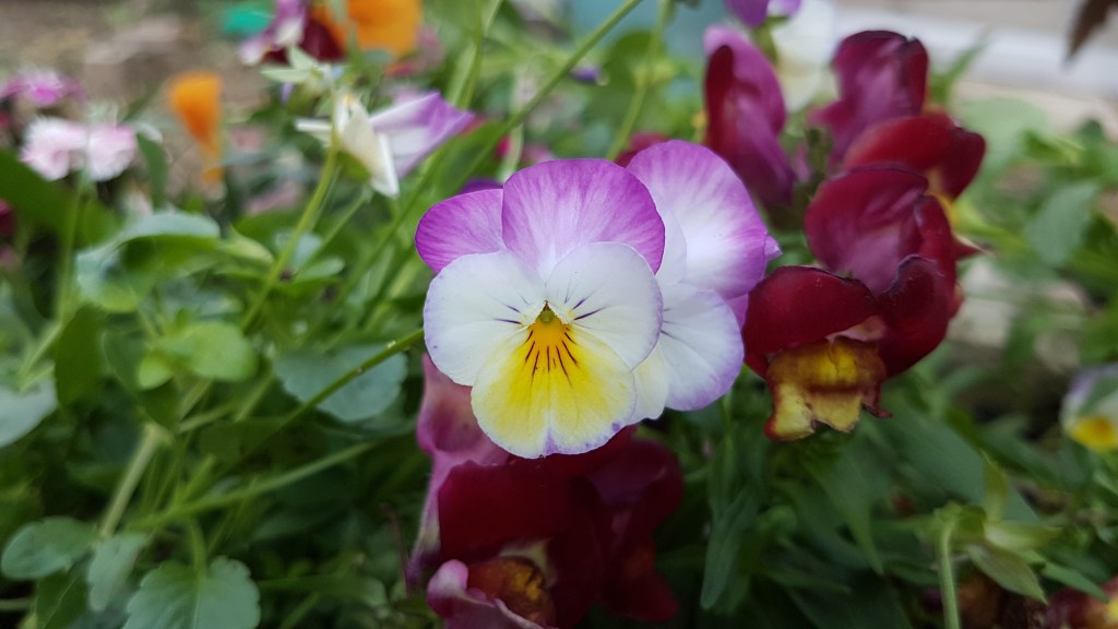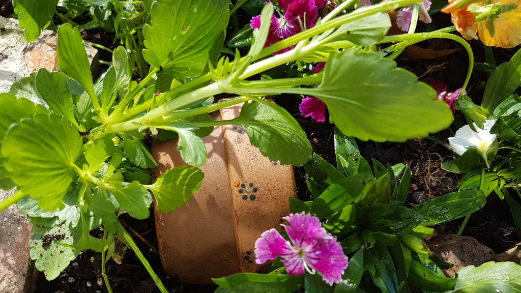 First, the Snapdragons, which we probably won’t eat because they aren’t very palatable. They are there for height in the centre, biodiversity and simple childhood joy! I have fond memories of playing with Snapdragons as a child and following tradition my children enjoyed “testing” the snapping power of each flower as we planted.