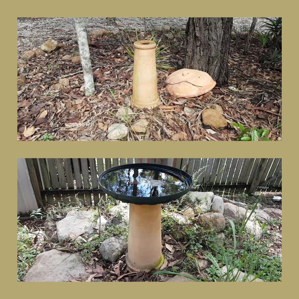 A birdbath is easy to add, easy to maintain and will help with pest control as well as delighting you with the antics of the birds. At the moment we’ve had an issue with animals, I suspect possums, knocking over our birdbaths in the night so we’ve found a quick fix until we can replace them. I always add a rock to the middle of the water so that insects can get out of the water easily. The birds love having a bath and they usually stick around long enough to gobble up some grasshoppers, caterpillars and other insects that are attacking my plants. The plants around the birdbath also enjoy the splashes of water from the birds’ energetic bathing habits.