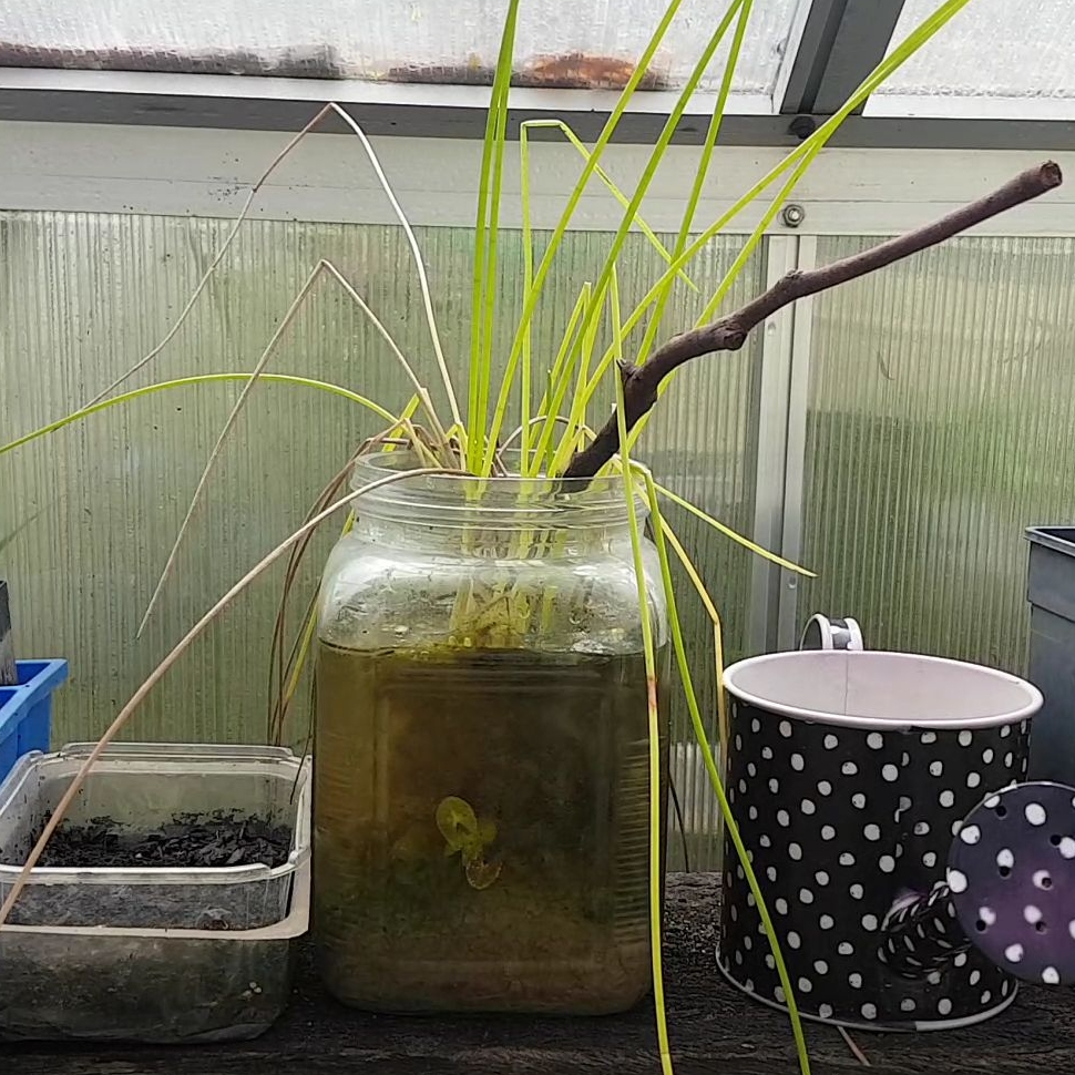 I solve the dragonfly larvae being eaten by adding this jar in my greenhouse which is rather full of algae right now. I am slowly replacing the water with clean water but I don’t want to disturb the dragonfly larvae which consistently populate its murky depths.