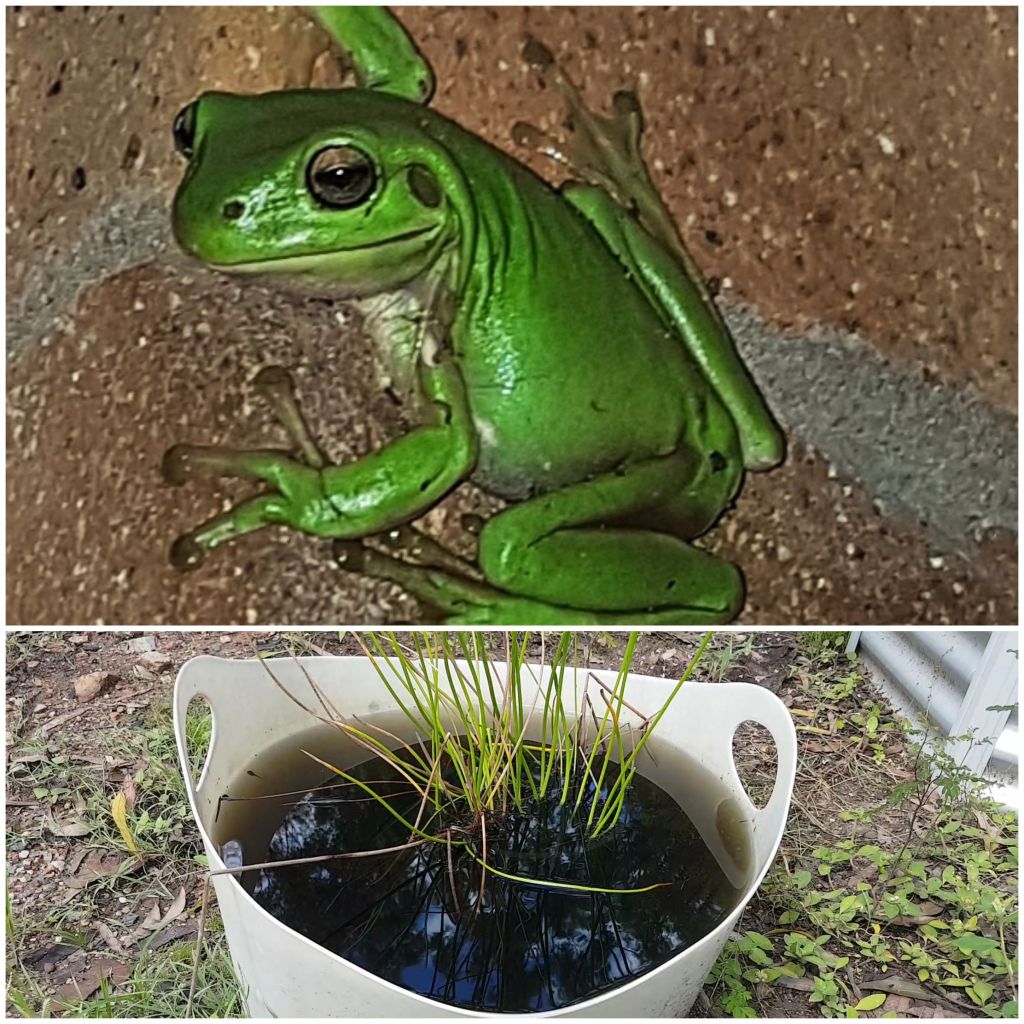 In the front yard I have made a pond using a large ceramic pot. I trim back and tidy it up when the weather turns cold, but right now I am letting it be to avoid disturbing frogs. The 65 centimetre height stops the Cane Toads from using it and also encourages dragonflies. Trust me, if you have water you want dragonflies. Dragonflies eat mosquitoes at every stage of their own and the mosquitoes development. One adult dragonfly can eat more than one hundred mosquitoes every day. To encourage them further and provide habitat for frogs, I grow reeds in the pond as well as lily pads. I’ve added a large stick and the broad base of a palm leaf to give shelter to tree frogs. Crayfish eat the algae and Firetail Gudgeons complete the ecosystem and help keep mosquito larvae under control.
