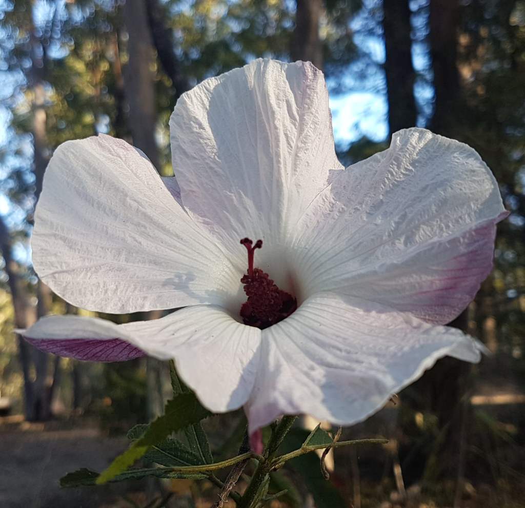 - Hibiscus “Pete’s Blush” – an impulse purchase that has paid off over and over again. This plant flowers all through Autumn and Winter. The blooms are delightfully delicate, white with blushes of pink and a deep maroon centre. The shaded location has made it somewhat straggly but it’s thriving. It has made me plant more Native Hibiscus in this “room”.