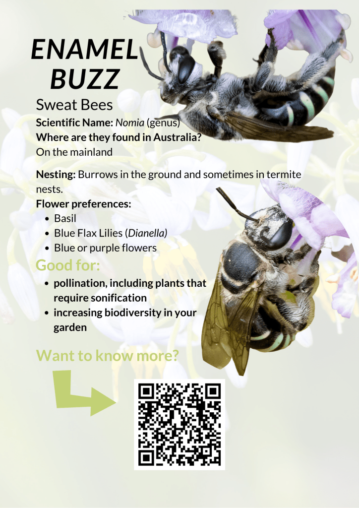 These buzz pollinators are in the Halictidae family. All of the Halictidae bees are said to be attracted to perspiration, explaining the common name of “Sweat Bee”.