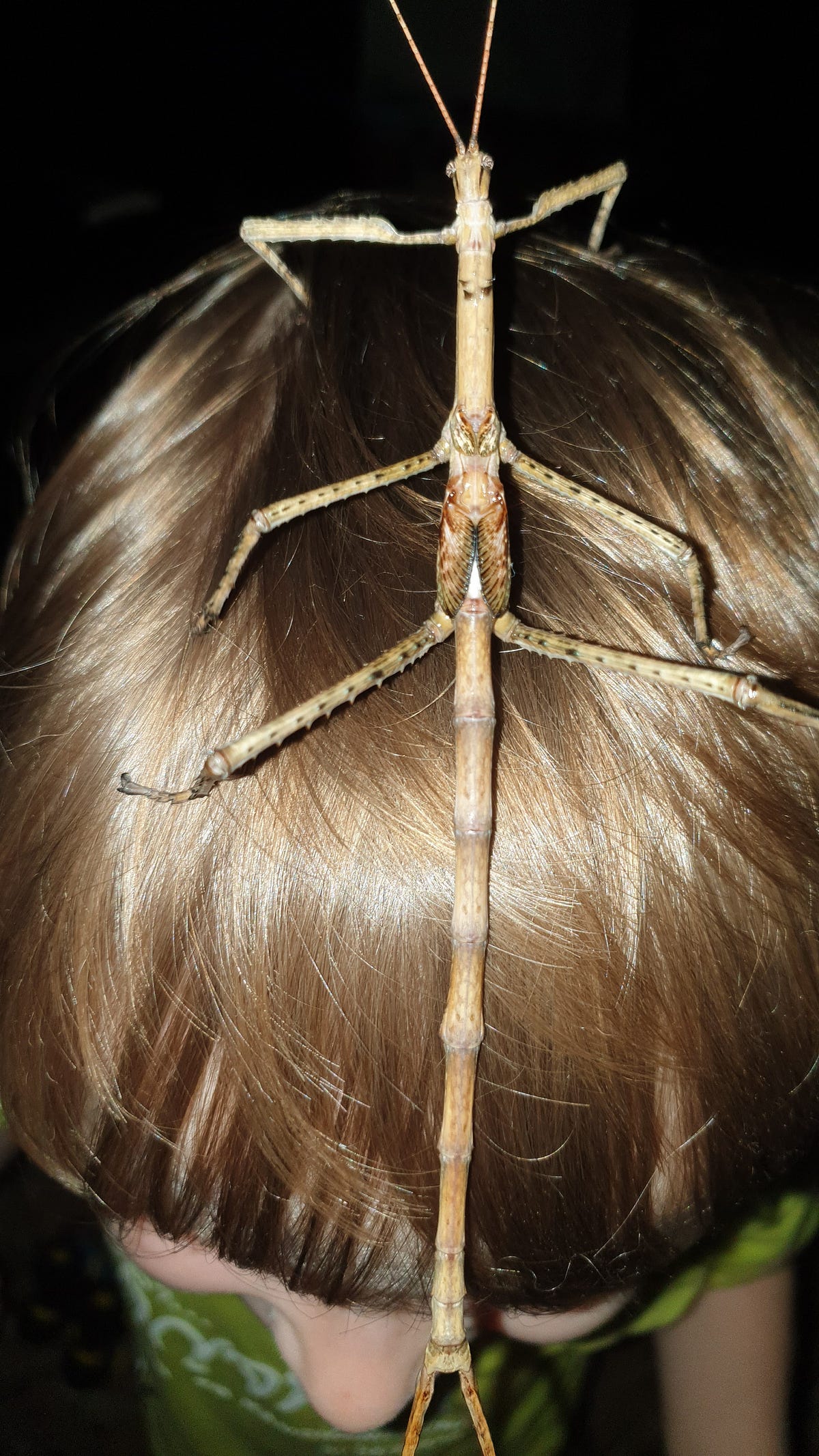 On Monday it was time to clean the stick insect enclosure and put in new leaves. Everyone had to come out of the enclosure when I cleaned, so the children giggled and squealed while the stick insects used them as jungle gyms. Despite their size, they are still juveniles. The one in the photograph is probably male and is starting to develop his wings. He’ll be able to fly when he’s an adult but the female will be too big so her wings are just for show.