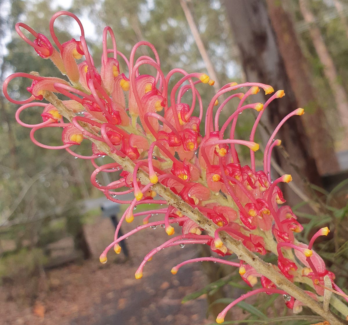This morning I went up to open the gate and saw a Grevillea flower sparkling in the sun with sprays like fireworks. It rained most of the night and the droplets are still hanging like little mirrors from petal, leaf, and needle, refracting and turning the world upside down in their magical depths.