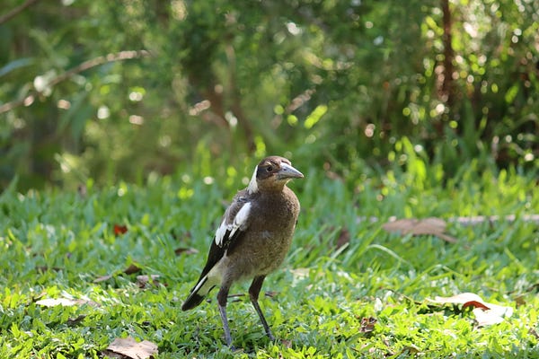 The Magpie fledgling is dear to my heart because the local Magpies have taken to introducing their fledglings to us every year which is a sacred trust. These clever birds can recognize human faces! So to be trusted with their young really means something.
