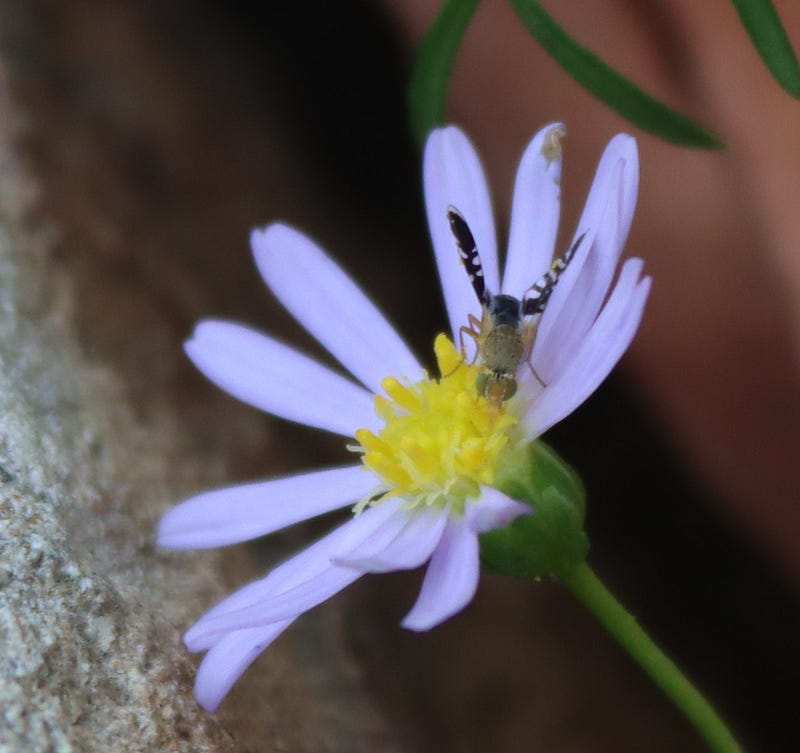 The next day was the second last day of the Wild Pollinator Spring Count Week in Australia, so I headed out to the flowers. This fruit fly was fascinating, about 2mm long with wings that swivelled and turned almost looking like tiny black ants from some angles. I think it’s probably a camouflage mechanism. The flower is the lovely Cut-leaf Daisy (Brachyscome multifida). I planted these ones but they are endemic to my area. The tiny blooms have regular traffic from pollinators all day.