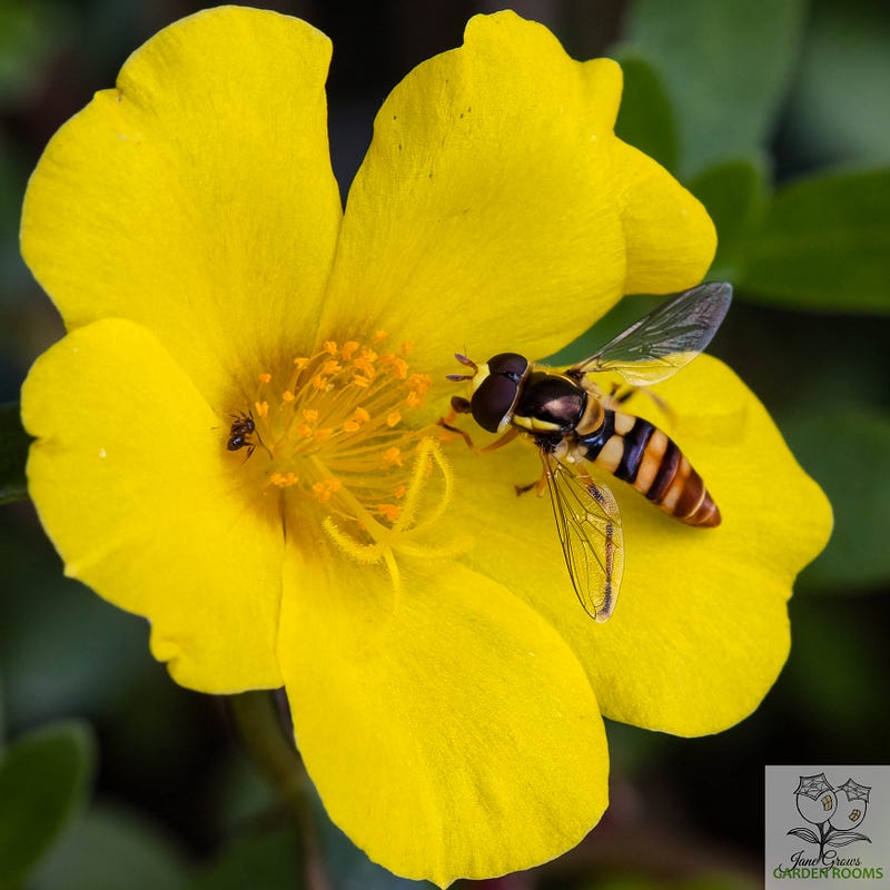 On Sunday I was thrilled to capture this Yellow-shouldered Hover Fly foraging in the Portulacas. I love the way its yellow markings are the same colour as the flowers.
